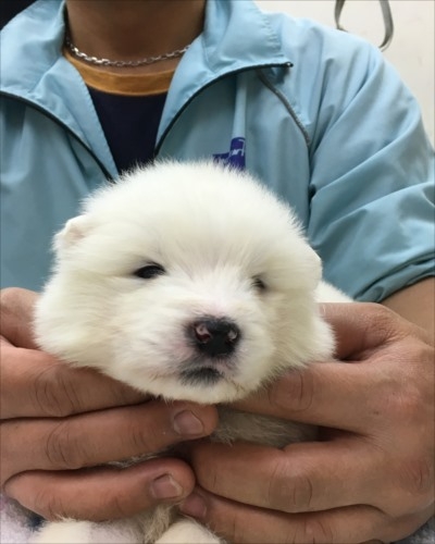 サモエド INT.CH.CH桃太郎君×INT.CH.CHエヴァン君の娘シャーロットちゃんとの間にかわいい~❤赤ちゃんが生まれました(*^_^*)生まれた時はピンク色だったお鼻も少しずつ黒くなって成長しています(*^_^*)是非お店に会いに来てくださいね~(*^_^*)